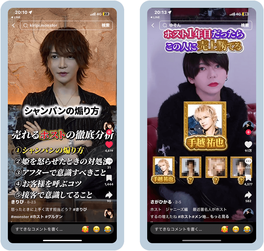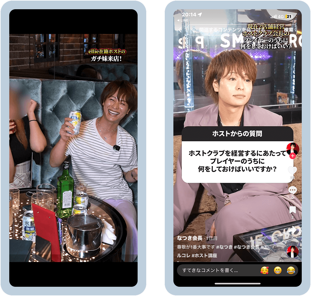 代表がエルコレの元1億1800万プレイヤーでホスト業界のことを誰よりもわかっているのでホストに通われてる方に刺さる内容、ホストのあるあるなど現場でプレイヤーをしていないと絶対に作れないような内容を作ることが可能です